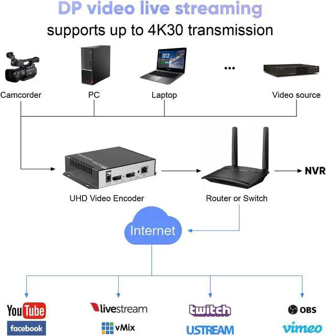 Innovative Product with Leading Technology This 4K30 video encoder is ideal for broadcast video and audio, support live broadcast for Youtube, Facebook, Ustream, Livestream, Twitch, Vimeo, Streamspot, Dacast, Tikilive, Netrmedi and other streaming servers.