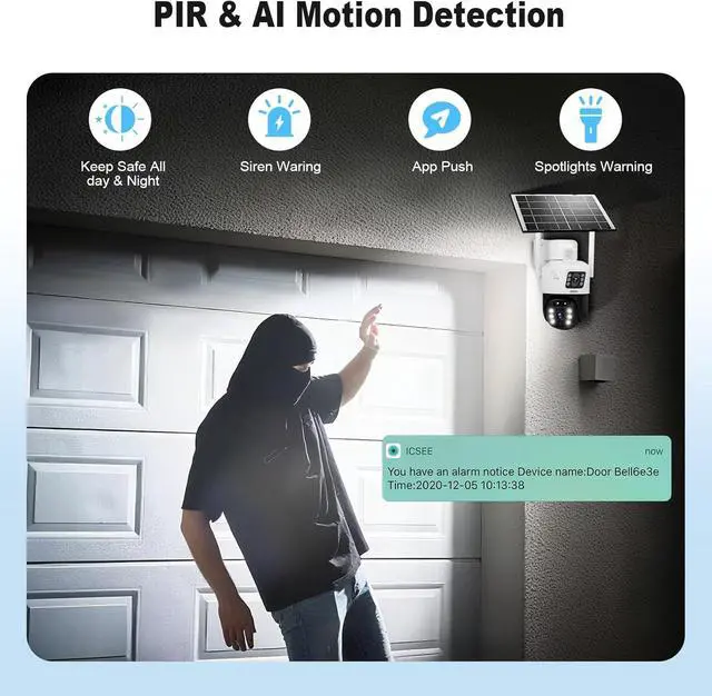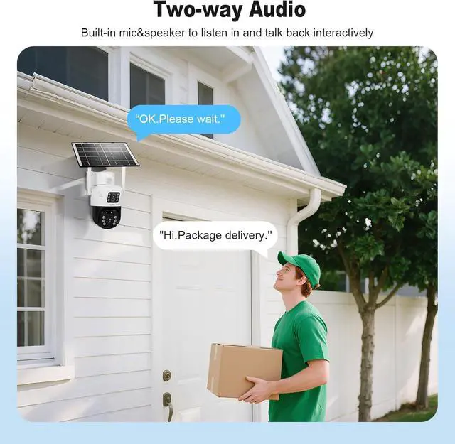 Two-way Audio High-Decibel AlarmThis solar camera outdoor wireless is equipped with high-quality microphones and speakers and supports real-time two-way voice call.Bring you a clear and smooth real-time two-way voice call experience.When you detect a visitor or a suspicious person, you can directly communicate with the on-site personnel through the mobile APP to confirm their identity or issue a warning. At the same time, it can also activate high-decibel alarm sounds and strong light flashing,protect the safety of families and family members.