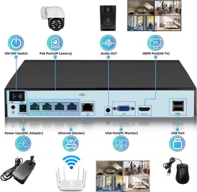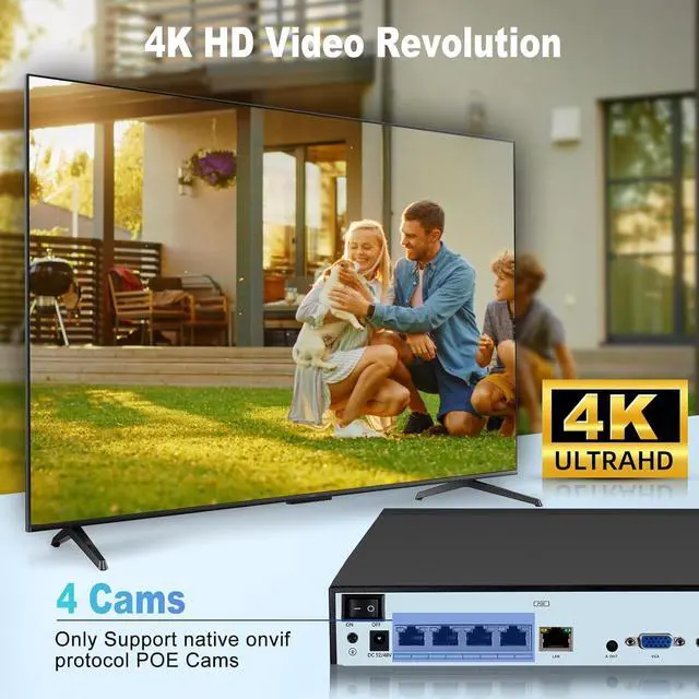 4K High ResolutionThis POE Network Video Recorder supports up to 4K/2K/8MP/5MP/4MP/3MP/1080P resolution, can clearly capture every detail. It is equipped with 4 POE ports to power and transmit data for 4POE cameras, meeting monitoring coverage requirements in different scenarios.Whether it is daily home monitoring needs, or small shops, larger commercial places, can achieve comprehensive monitoring.