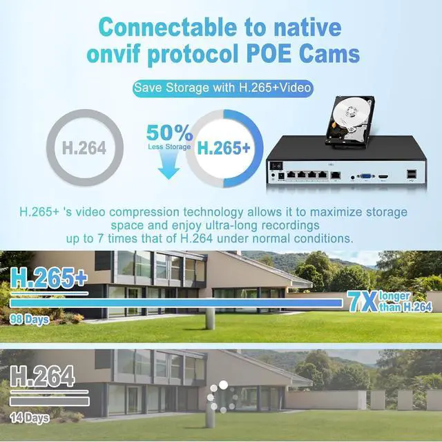 H.265+ Video CompressionThis 8Channel NVR Recorder adopt the advanced H.265+ video compression technology, compared with the traditional compression method, can effectively save about 50% of the hard disk storage space, so that the recorded video can be saved longer, in the limited storage conditions to achieve longer monitoring records retention.Our NVR supports the native onvif protocol, supports POE power output, and can be paired with IP POE cameras.