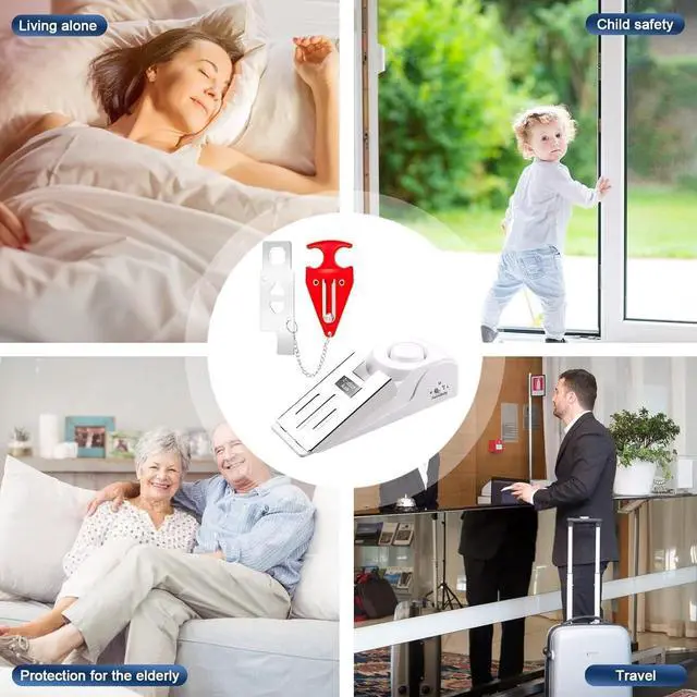 Door Stoppers Security Kit-The door stopper alarm in the "ON" status, once someone tries to break in, the door stopper will obstruct and make a loud alarm with 120 dB (volume can not be adjusted) to alert. And the portable door lock provides you with dual protection, preventing unsafe external entry, greatly improving the security of you and your family.