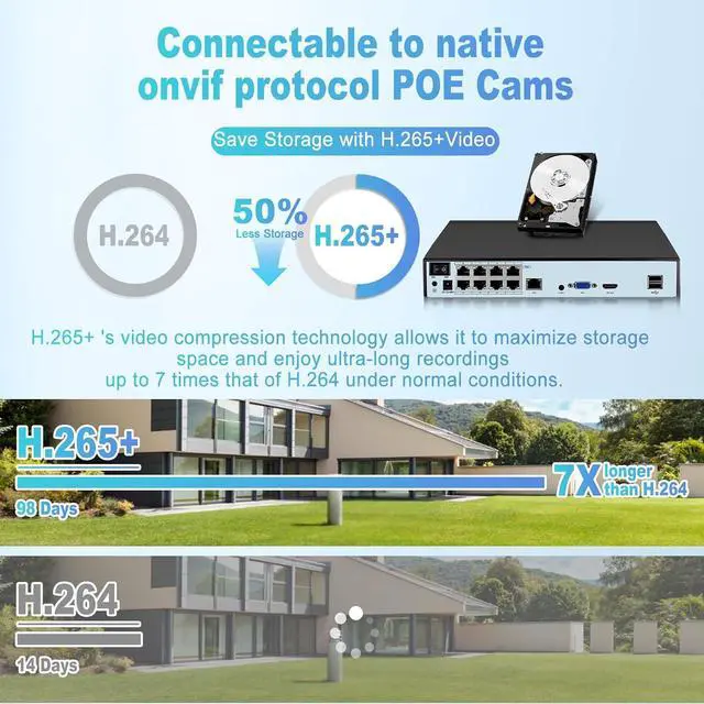 H.265+ Video CompressionThis 8Channel NVR Recorder adopt the advanced H.265+ video compression technology, compared with the traditional compression method, can effectively save about 50% of the hard disk storage space, so that the recorded video can be saved longer, in the limited storage conditions to achieve longer monitoring records retention.Our NVR supports the native onvif protocol, supports POE power output, and can be paired with IP POE cameras.