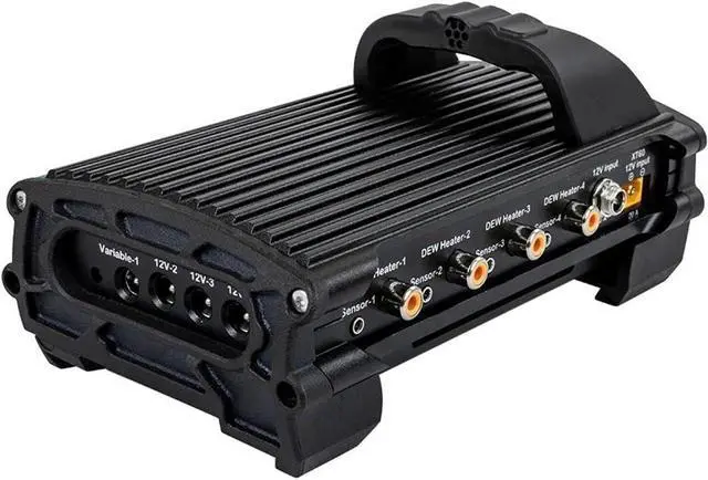 Smart control system monitors ambient temperature and humidity and adjusts power to four dew heaters automatically