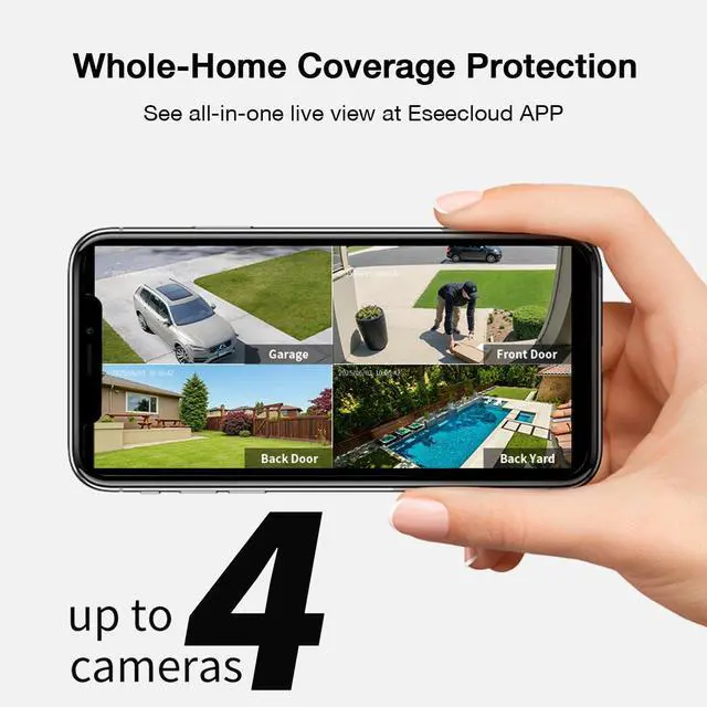 Easy Setup & Family Sharing: All four wireless outdoor cameras come pre-paired with the base station. Plug in the base station, connect it to Wi-Fi, and pair it in the EseeCloud app. Then mount the cameras where you want, and your smart security system is ready to go. You can also share access with family members for added peace of mind.