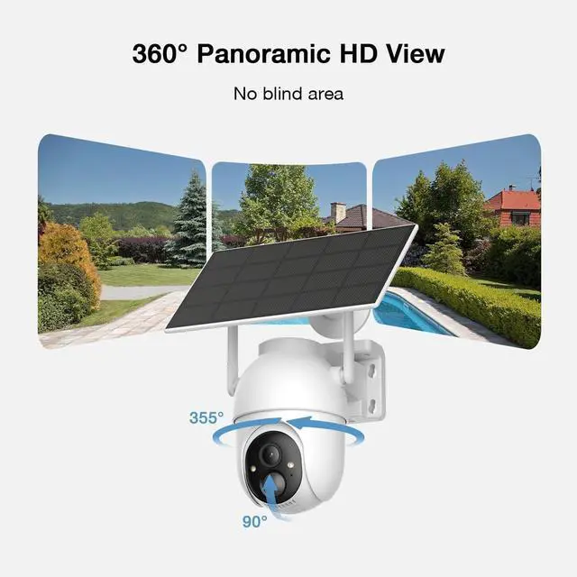 2K/4MP Color Night Vision and 360° View: Experience 2K/4MP HD color night vision with our wireless outdoor security cameras. The spotlight turns on automatically at night to deliver vivid, full-color night vision, and the 350 ° pan/90° tilt range covers your entire yard with zero blind spots.