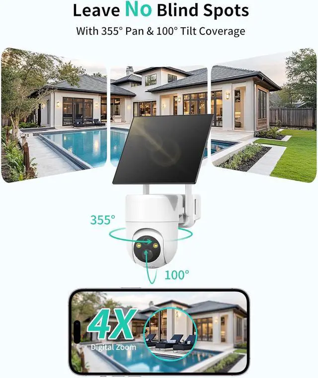 2K HD Color Night Vision and 360°SurveillanceCapture crisp 2K HD footage day or night, with a spotlight for full-color night vision. The surveillance camera outdoor offers 355° pan and 100° tilt for flexible, wide-angle monitoring