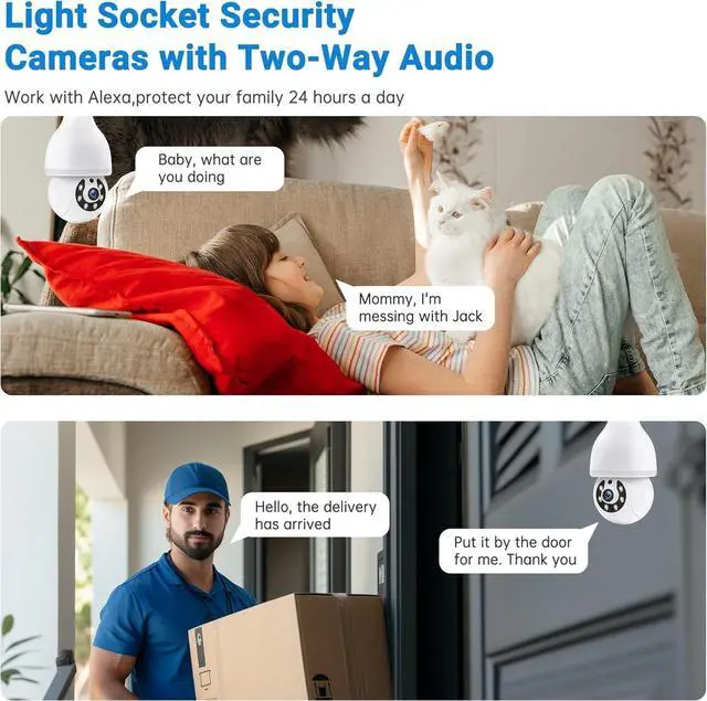 Two-Way Audio, Human Detection & Tracking with Real-Time AlertsOur lightbulb security camera is with built-in microphone and speaker for 2-way talk and real-time call, communicate with your family members or visitors without any obstacles, realize face-to-face communication. Our lightbulb camera outdoor can set up an audible alarm, when detecting moving objects the light bulb camera wifi outdoor will emit a loud alarm sound and white light at the same time. Scaring away intruder and protecting the family safety. The light bulbs camera can work as porch light and also a security camera to discreetly monitor visitors and deliveries