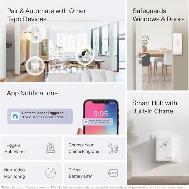 This purchase includes 3x Tapo T110 Contact Sensors and 1x Tapo H100 Smart Hub with Chime. Tapo enhances home security and convenience through its ecosystem of smart devices managed by the central Tapo Hub. Contact sensors placed on doors and windows allow users to remotely check their status via the Tapo app, eliminating uncertainty. The Hub utilizes an ultra-low power protocol, extending the battery life of connected sensors, switches, and buttons up to tenfold. For integrated security, opening a door or window can trigger paired Tapo pan/tilt cameras to track movement and sound an alarm on the Hub, while real-time app notifications and an activity log provide immediate awareness and review capabilities. Furthermore, these sensors can be paired with smart lighting for automated illumination in designated areas. Installation is effortless with magnetic and adhesive mounting options, and the sensors' compact size ensures discreet placement throughout the home. Each Tapo contact sensor is measured as 2.42 x 1.48 x 0.48 inches. The Tapo Smart Hub is measured as 2.8 x 2.5 x 2 inches.