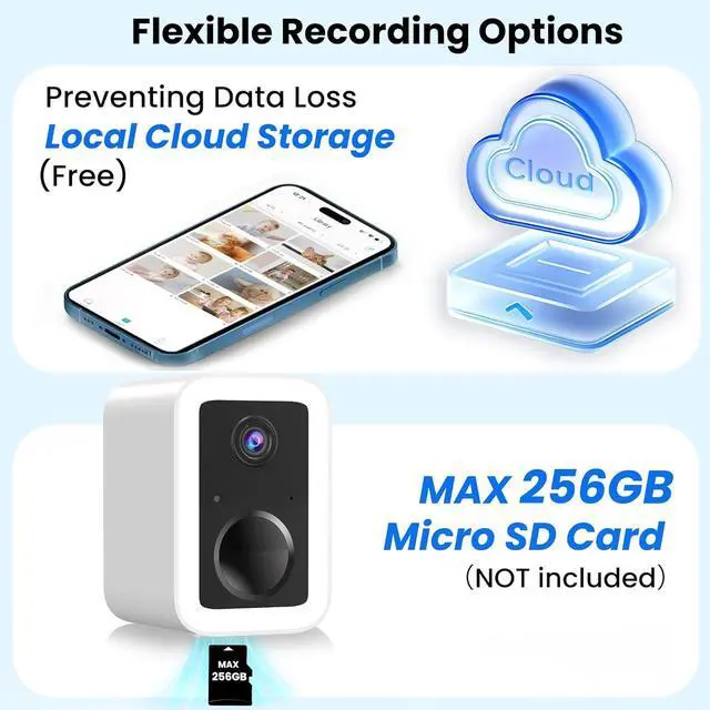 Free Cloud Service & SD Card SupportEnjoy 3-day rolling cloud storage and all the features within the app, without additional subscription fees. Store and view your recordings securely. (NOTE: Free plan provides SD quality; HD quality requires a subscription). Also supports SD card storage (up to 256GB; NOT included), providing flexibility based on your preference.