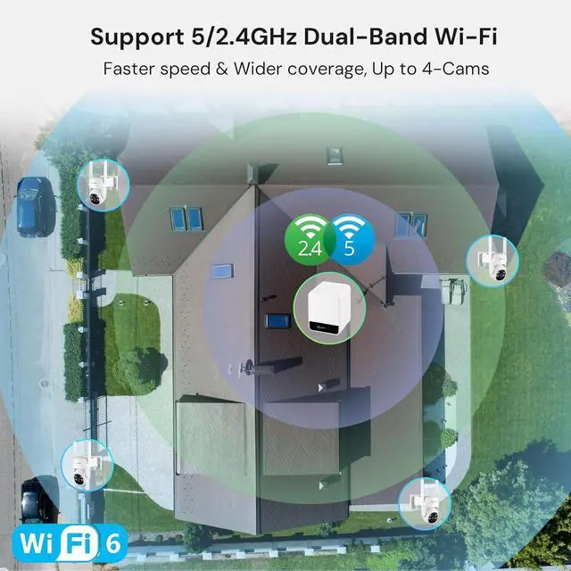 WIFI 6 & Dual-Band Technology: Homebase supports Ethernet or Wi-Fi connection. Newly upgraded Wi-Fi 6 and 2.4 Ghz & 5 Ghz dual-band make the base station a stable Wi-Fi extender. Compared with regular Wi-Fi connected cameras, the wireless security camera system extends coverage via 2.4GHz, increases transmission rate and stability via 5GHz, even if the solar outdoor wireless cameras are located on the roof, yard, or garage