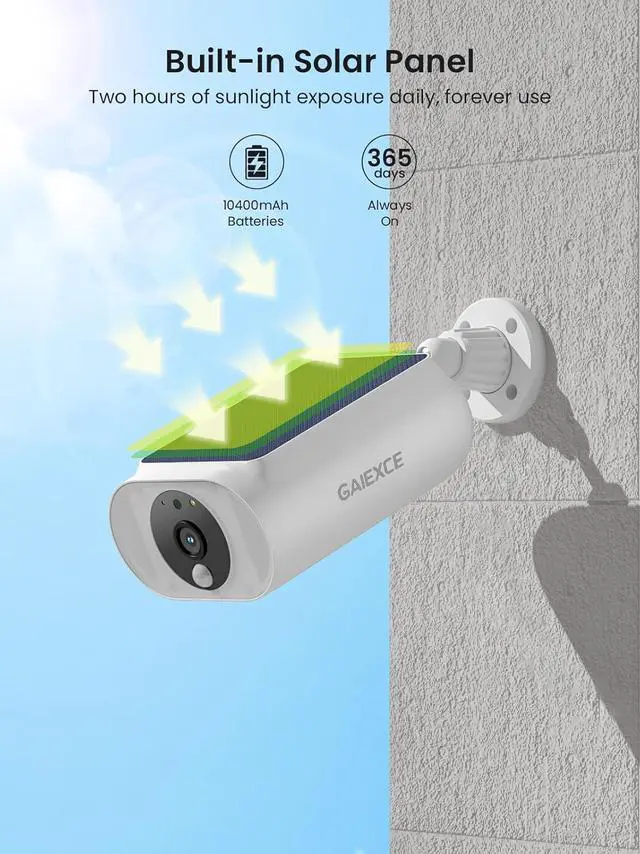 Solar + 10400mAh Long-Lasting Battery Integrated solar panel and a 10400mAh rechargeable battery deliver true wire-free convenience. Even without sunlight, the camera runs up to 6 months on a full chargeensuring 24/7 protection with zero maintenance.