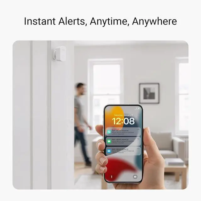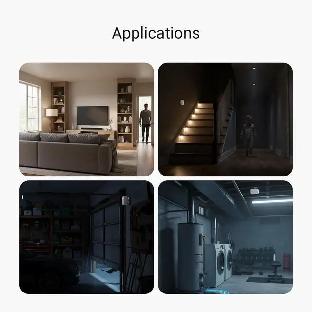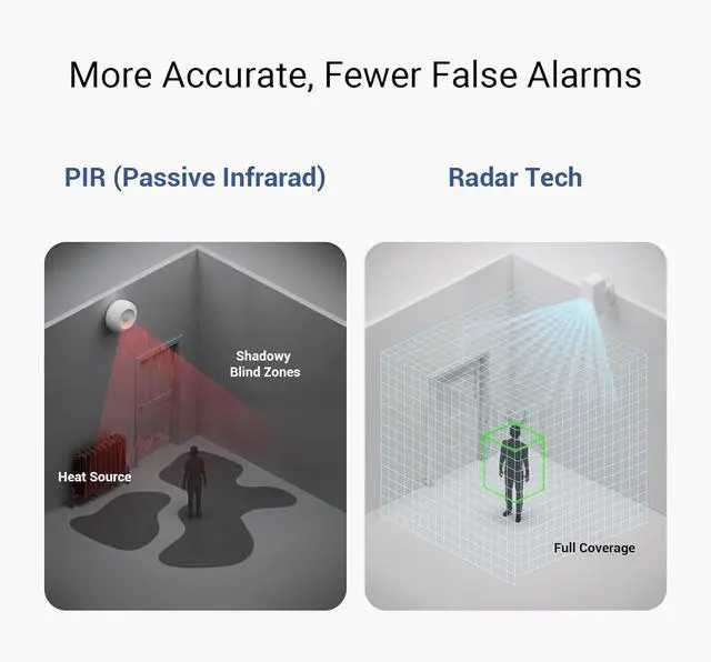 Radar Accuracy + Long Range Reliability Precision Motion Detection Reliable Coverage Everywhere 2-Year Battery Life Adjustable Sensitivity Alert Hold Time Alarm Suppression No-Motion Detection Real-Time Alerts Living Room Hallway & Stairs Garage & Basement Pet Monitoring