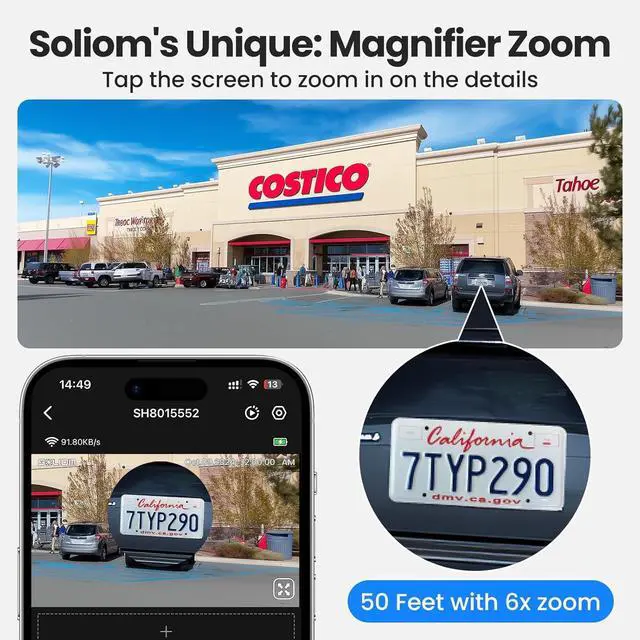 1New Radar Technology2Efficient Solar Charge3Stable Wi-Fi Coverage4All-Angle Surveillance5Monitor Specific Area1Unique 6x Magnifier2Panorama Location Bar3Share with Neighbors4Easy Control All Cameras5One-tap Day Browse Product NameSH801-2BrandSoliomMain new features4K UHD Resolution, 8MP Full Color Night Vision, Magnifier