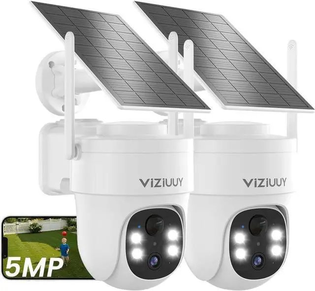 5MP 3K Ultra HD & Color Night VisionVIZUUY solar camera security outdoor comes with 5MP (2560*1920)resolutions, provides more clear video than 2MP/3MP outdoor wireless camera. Upgraded 4pcs bright spotlights provide you with color night vision, the visible distance is up to 50ft/15m. Get picture-perfect live video with this solar powered security camera no matter during the day or night