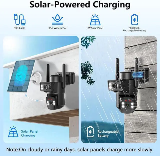 [Provide A Steady Stream of Energy] Solar wireless outdoor security cameras are equipped with solar panels and are 100% wireless, eliminating the need to re-lay wires and saving costs. After successful installation, it can provide energy to your security camera permanently. The camera supports both 2.4ghz WiFi and 5ghz WiFi.