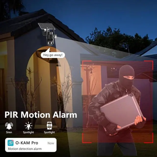[PIR Motion Detection] Built-in sensitive PIR motion sensor effectively distinguishes humans from other things and reduces false alarms. Once any abnormality occurs in the monitored area, you can receive a real-time push on your mobile phone. The solar camera outdoor wireless automatically tracks the movement of intruders and activates the alarm sound and spotlight to deter unwanted visitors. Support custom detection areas, only focus on key areas.