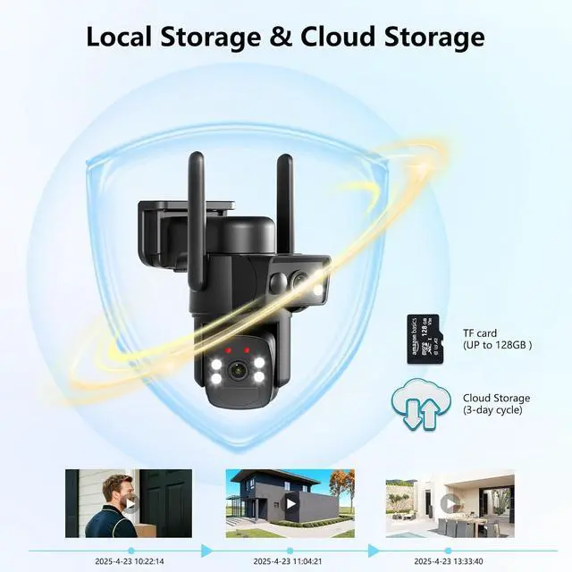 [Local Storage & Cloud Storage] Solar security camera outdoor wireless supports micro SD storage and cloud storage(cloud storage need subscription), and the local storage supports up to 128GB (micro SD card not included). You can access and play it anytime and anywhere through the APP.