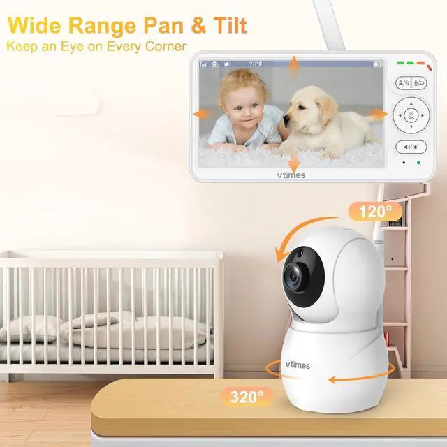 320° Pan & 120° Tilt and Multi-FeaturesThe baby monitor with camera and audio can rotate 320° horizontally and tilt 120° vertically, providing a complete view of your babys room. Additional smart features include infrared night vision, room temperature and feed time alarm, lullabies, and more, offering comprehensive care for your baby