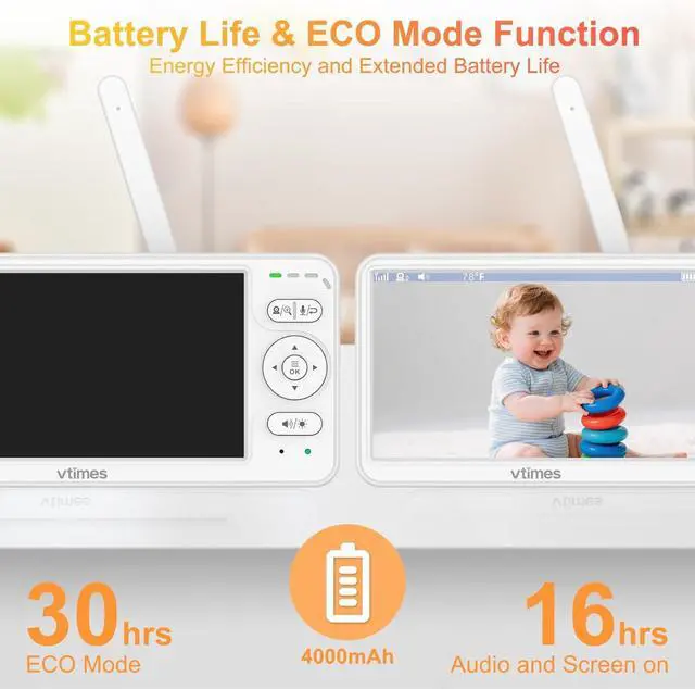 Longer 30-Hour Battery LifeEquipped with a high-capacity battery, this baby camera monitor offers up to 30 hours on ECO of standby time, allowing you to monitor your baby throughout the night without worrying about frequent recharging. Enjoy continuous, reliable monitoring for peace of mind