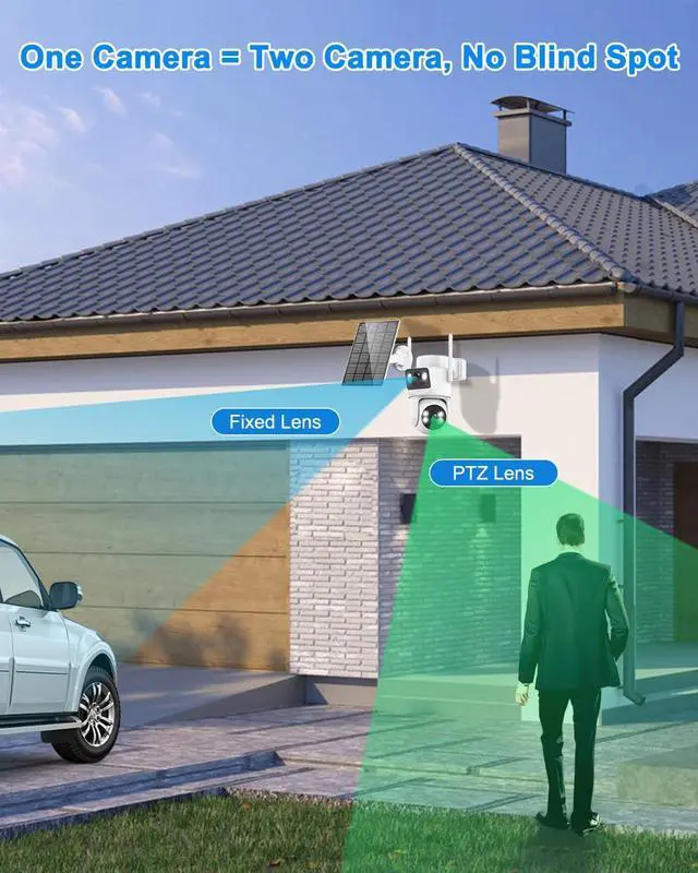 Dual Lens & Double SecurityThe outdoor camera wireless designed with dual lens for full coverage to avoid blind spot. The bullet camera is fixed in one position to provide wide angle surveillance. The dome camera rotates 355° horizontally and 90° vertically to eliminate blind spots. One camera but function as 2 to guard your home.