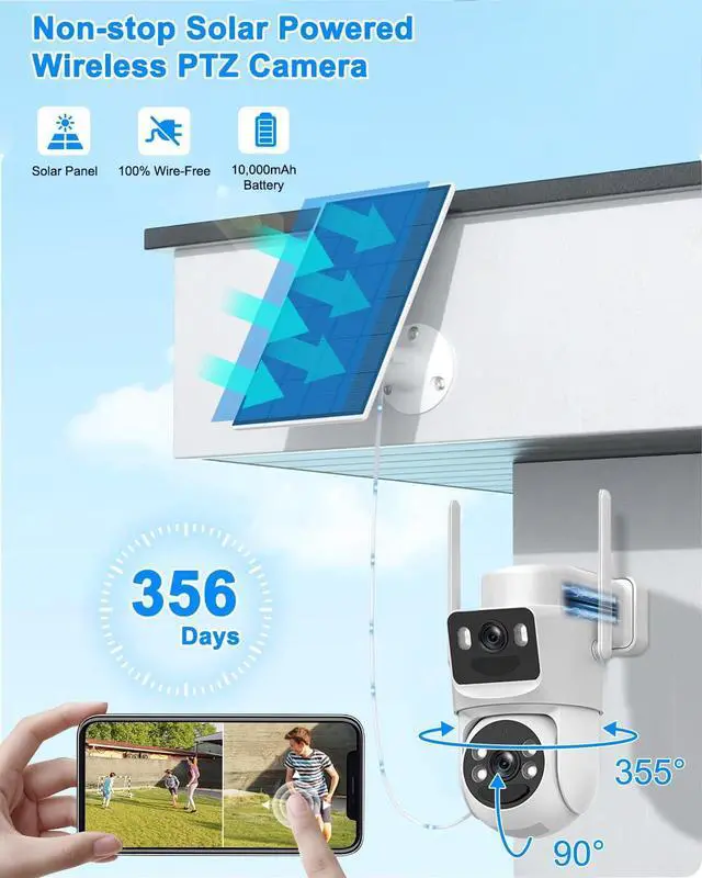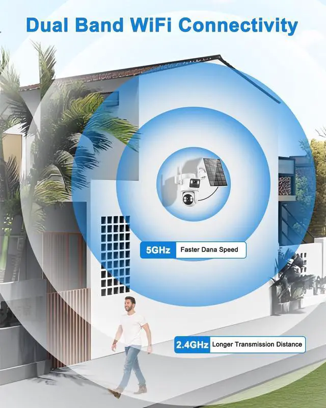 Solar Powered & 5GHz/2.4GHz WiFiThe wireless security camera outdoor is equipped with a 10000mah rechargeable battery and solar panel to ensure 365 days of uninterrupted power supply. Supports both 2.4GHz and 5GHz WiFi for a more stable and faster connection, reducing lag and disconnection issues.