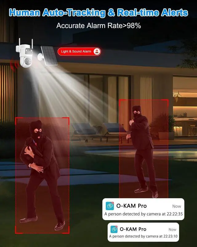 Human Auto-Tracking & Insant AlertsWith its advanced PIR motion sensor, the outdoor camera can accurately identify human movement and automatically track the motion. When suspicious activity is detected, the security camera will send instant notification to your phone, records videos, activates alert sounds and lights to deter unwanted visitors. IP66 Waterproof withstand rain, sun, heat and cold for year-round security.