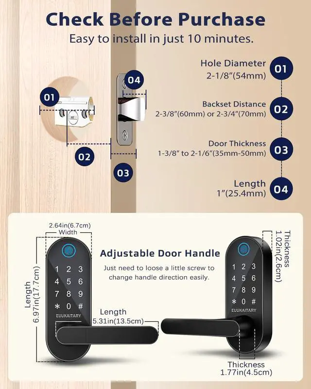 10-min DIY Install No-drill setup for this smart locks for front door: Fits standard US/Canada doors (left/right door handle adjustable) Capable of self-installation BY anyone. Fits standard doors faster than ordering pizza upgrade to a bedroom door lock with code in minutes