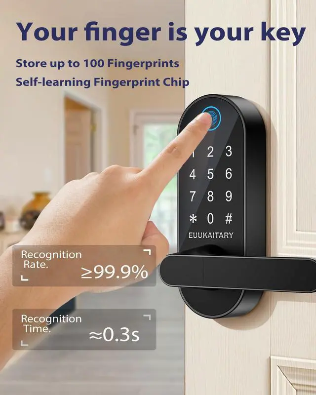 Bank-Grade Fingerprint Security 0.3s Intelligent-Chip Recognition Capable of blocking intruders with 99.9% accuracy. Used by forgetful homeowners or rushed parents unlock this keypad door lock with handle faster than fumbling for lost keys
