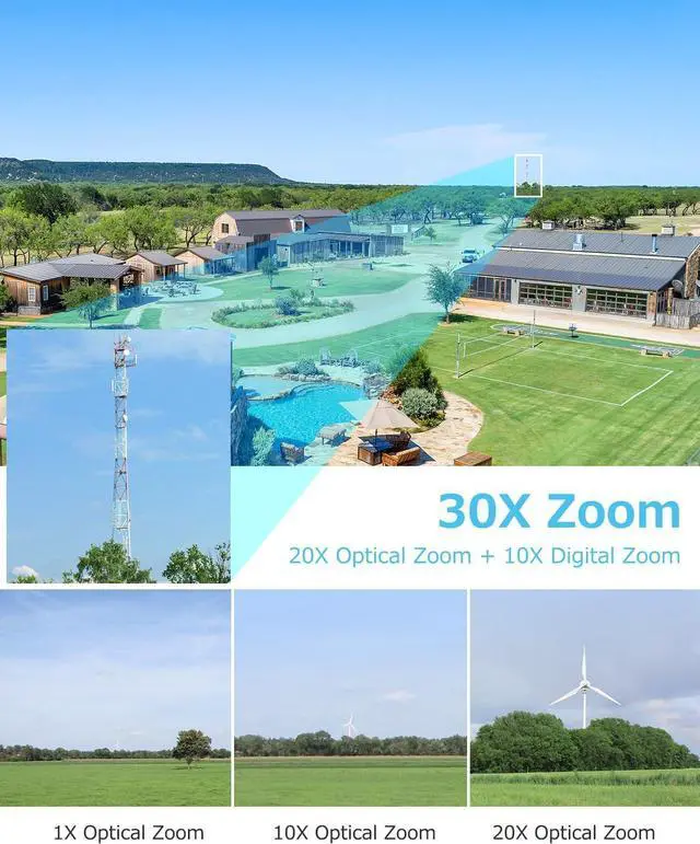 Ultra 4K HD & 20X Optical ZoomThis 8MP PTZ camera outdoor features ultra-high clarity of 4K Ultra HD, which is 1.6 times sharper than the 5MP cameras. With 4.7~94mm motorized lens, it allows 20X optical zoom & 10X digital zoom without impairing image quality. It supports viewing the car license plate remotely, great for use in large places such as parking lots, hypermarkets, gardens, roadsides, etc. NOTE:4K cameras have high network requirements, please pay attention to checking your network environment.