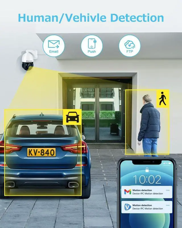 320ft Night Vision & Remote AccessAdvanced night vision with 6 high-performance infrared LED lights, can extend the viewing distance to 320 feet. Automatically switch day/night mode through IR-cut, and maintain real-time and accurate intelligent motion alarm in black-and-white mode, even in the dark. Easy to add your PTZ camera to phone via APP, You can not only enjoy real-time video, play, take snapshots, receive motion alerts, but also share real-time video with family and friends.