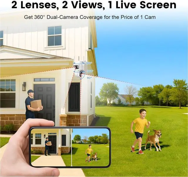 Dual-Lens SystemGet the 360° Coverage of 2 Pro Cams for the Price of 1Unlike any single-lens camera that forces a trade-off between a wide view and a close-up, our wireless security camera outdoor system features both a fixed wide-angle lens and a remote-controlled PTZ lens. This allows you to monitor a broad area permanently while simultaneously zooming in on any activity, effectively eliminating blind spots. This represents significant cost savings, as it delivers a comprehensive two-camera monitoring solution that eliminates the need to purchase, install, and maintain a second device.It would be the ultimate all-in-one solution in outside cameras for home security.