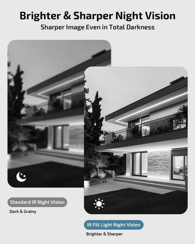 IR Fill Light Night VisionEquipped with infrared fill lights, cameras deliver bright, noise-free black-and-white night vision. Ideal for low-light areas, outdoor security, and continuous remote monitoring, ensuring clear footage day or night with wired surveillance cameras.