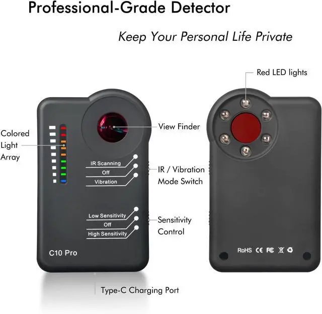 Protect privacy for you and your beloved ones This bug detector offers a simple, portable, and discreet method of identifying and eliminating unwanted surveillance threats. Easily detect all types of RF transmitters including: bugs; body wires / GPS trackers / bumper beepers / eavesdropping transmitters etc., and quickly identify both wired and wireless hidden cameras, pinhole cameras and more. Effectively prevent your privacy leaks.