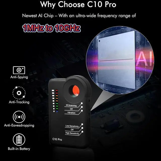What makes this new generation detector better than similar ones? - Equipped with the most cutting-edge and high-accuracy AI chip, it is a professional hidden device detector which can detect any RF transmitters in as wide as 1 MHz to 10 GHz frequency range and it can find transmitting and non-transmitting cameras, on or off, wired or wireless, dead or alive. 1 Camera Finder, 2 Levels of Sensitivity, 3 Detection Modes Visual, Vibration and Mixed, 9 Levels of Signal Strength Meter.