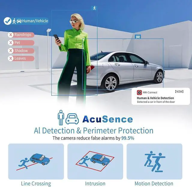 AcuSense technology with deep learning algorithms to accurately identify human and vehicle movements while filtering out irrelevant alerts, minimizes false notifications and enhances monitoring efficiency for precise security coverage