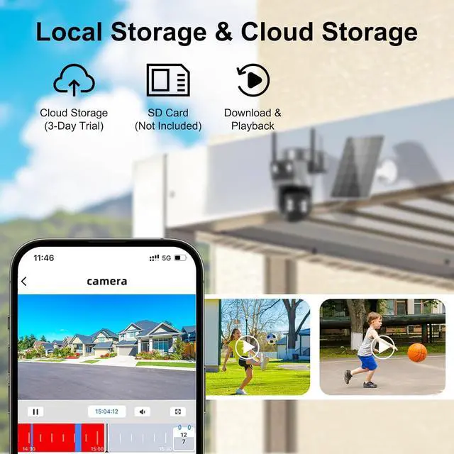 4K HD & Color Night VisionThe dual lens solar camera is equipped with a 4K HD lens, which provides full HD images and videos that are clearly visible during the day and night. Equipped with white light and infrared light, 3 night vision modes (full color/infrared/intelligent vision) for you to switch freely, dual lens design, panoramic and partial view, allowing you to see clearer details in the dark.