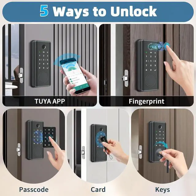 5-in-1 Keyless Entry System Features fingerprint, password, IC card, Bluetooth app, and mechanical key unlocking methods, eliminating the need for traditional keys. Perfect for smart homes, families, and rental properties where multiple users need flexible access.