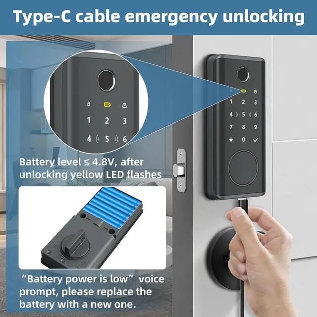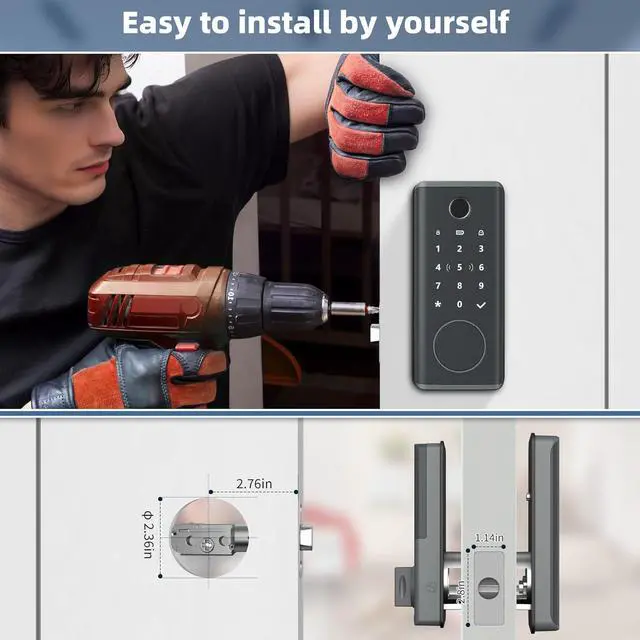 Easy Installation with Adjustable Latch & Universal Compatibility Fits 3540mm thick wooden doors with adjustable 60mm/70mm latch length. Includes drilling templates and all mounting hardware. Type-C emergency power port ensures access even if batteries are depleted.