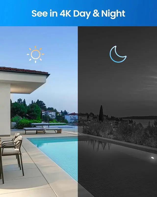Crisp 4K Video & 100ft Night Vision--Experience ultra-clear 8MP 4K resolution with H.265+ compression for sharper details and 50% less storage usage. Built-in IR LEDs provide 100ft night vision in total darkness, while 3D DNR reduces noise for cleaner footage day and night.
