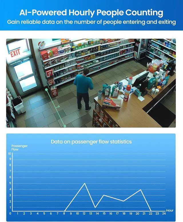 AI-Powered Hourly People Counting--This system automatically counts people entering and exiting any space (stores, offices, venues, etc.), providing reliable hourly data to optimize operations, improve customer experience, and enhance security.