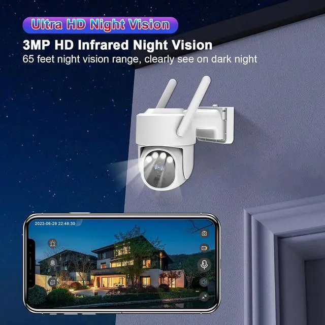 2K 3MP Stunning Video Quality&Pan&Tilt&Zoom This Camera can turn its head 355° horizontally and 120° vertically, which shows you everything in 3MP HD. With Dual-source lighting for night vision (night vision distance = 30 m) comprising infrared lamp / white-light source; color images available for night vision.