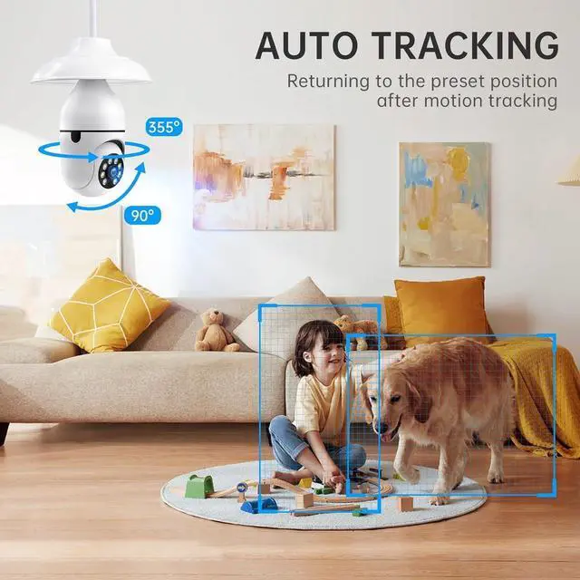 360° Panoramic View & Remote Control: Remotely control your light bulb camera for 355° pan and 90° tilt coverage. Use it as a pet camera or set automatic patrols to monitor your space effortlessly