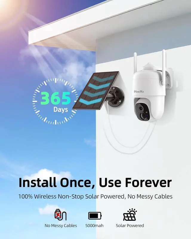 100% Wireless & Solar-Powered ConvenienceEnjoy year-round security with our wireless solar security camera outdoor! Its high-efficiency solar panel (23% conversion rate) keeps the battery charged 365 days - no outlet needed. Install anywhere in minutes without messy wiring. Never climb a ladder to recharge batteries again!