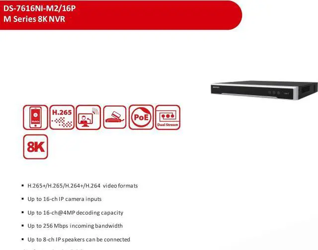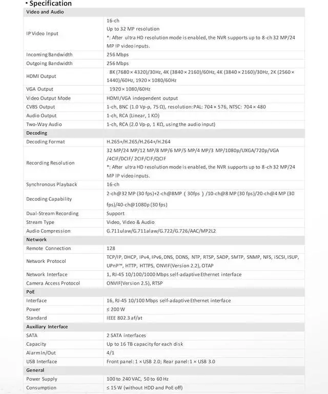 Supports 16 IP Cameras and up to 32 MP resolution, after ultra HD resolution mode is enabled, the NVR supports up to 8-ch 32 MP/24 MP IP video inputs.