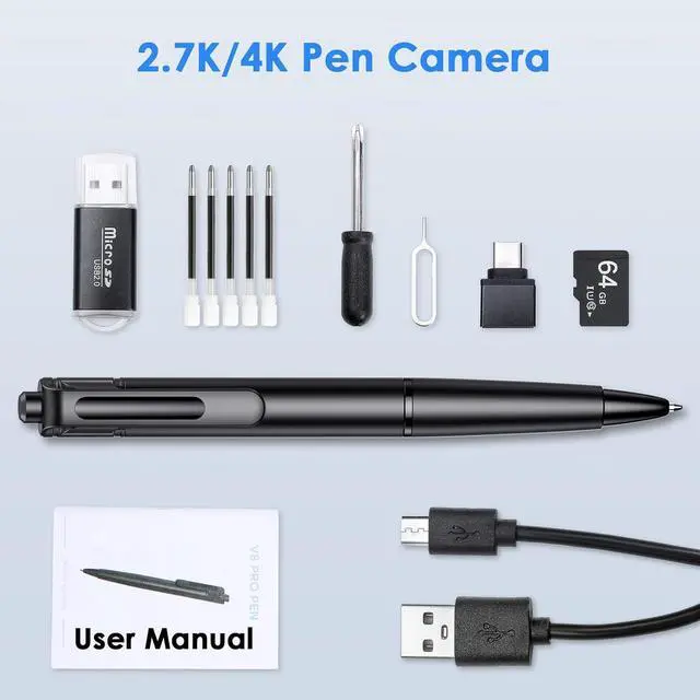 Camera Included: Pen Camera*1, USB Data/Charging Cable*1, Replaceable Refills*5, Card Reader*1, 64GB SD Card*1, Instruction Manual*1.