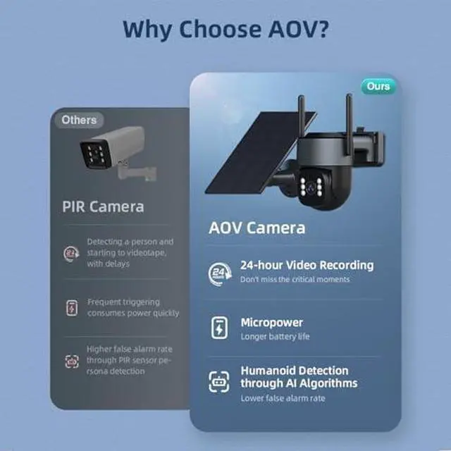 Solar Powered & Smart AOV RecordingFeaturing a 7W solar panel and a built-in 9000mAh rechargeable battery, this solar security camera truly runs off-grid. The unique AOV recording system captures motion at 15 fps and switches to low-power 1 fps (customizable) during inactivitycutting power use by up to 90% and allowing continuous operation for nearly a month