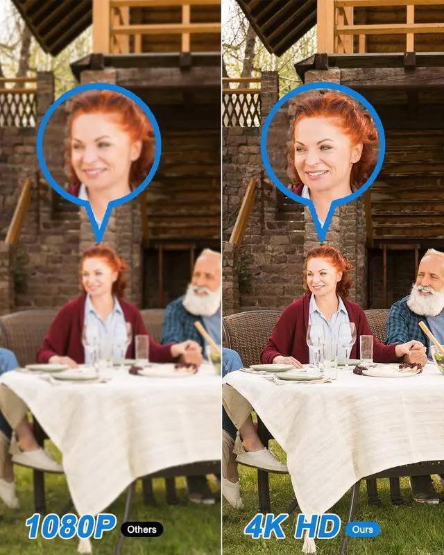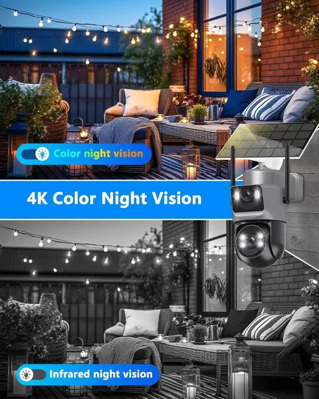 4K HD Color Night VisionThe outdoor camera offers stunning 4K full HD resolution for day and night. Advanced color night vision technology allows you to enjoy ultra clear and color image at night in low light condition.