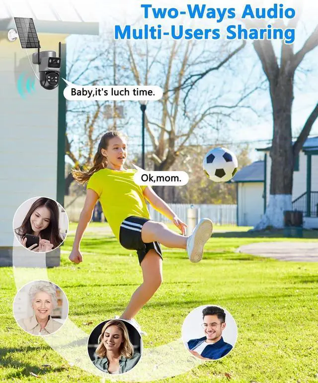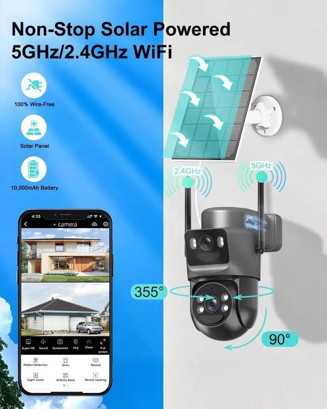 Solar Powered & 5GHz/2.4GHz WiFiThe wireless security camera outdoor is equipped with a 10000mah rechargeable battery and solar panel to ensure 365 days of uninterrupted power supply. Supports both 2.4GHz and 5GHz WiFi for a more stable and faster connection, reducing lag and disconnection issues. IP66 Waterproof withstands rain, snow and high temperatures.