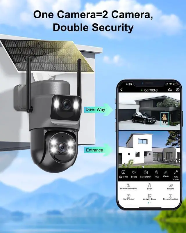 1 Device=2 CamerasThe Outdoor Security Camera features dual lenses (dome+bullet camera). The upper lens for the fixed viewing angle monitoring, the lower lens can be flexibly rotated 355°Pan & 90°Tilt for different angles monitoring, achieving the security needs of two different areas, great for home, front door, garden, warehouse, backyard, garage, shop surveillance.