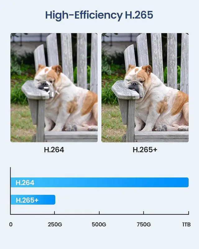 (5). [ Advanced H.265+ Video Compression ] __ ZOSI's self-developed H.265+ technology optimizes video compression by focusing on key surveillance scene characteristics, resulting in larger storage capacity and enhanced image quality. Compared to H.264, H.265+ saves about 80% of storage space, providing smoother playback and more efficient storage management.